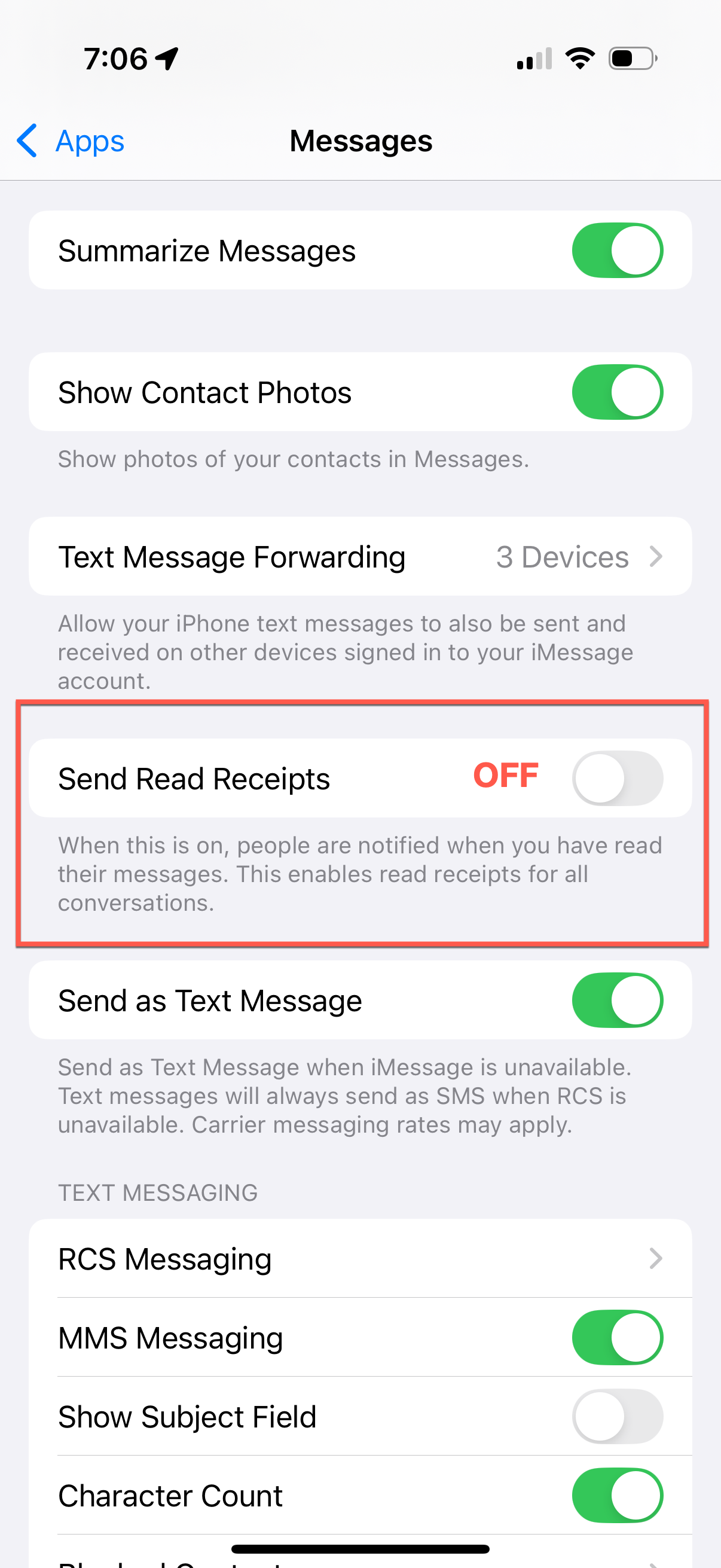 First, change the default settings – under Settings > Apps > Messages – make sure Send Read Receipts is set to OFF.
